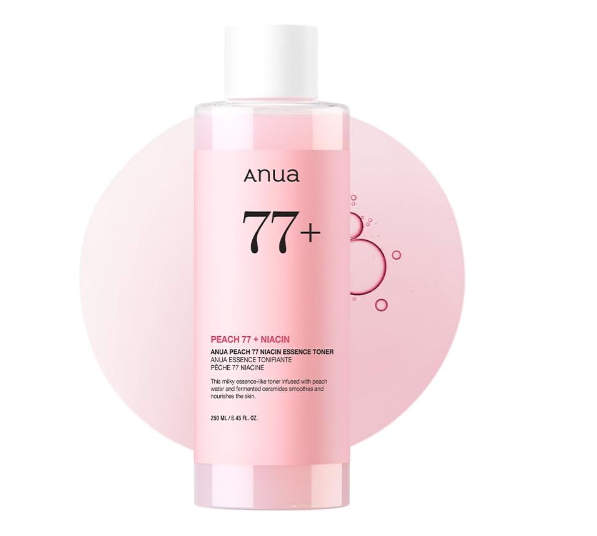 Essence-toner hybrid with 77% peach and niacinamide for glow.